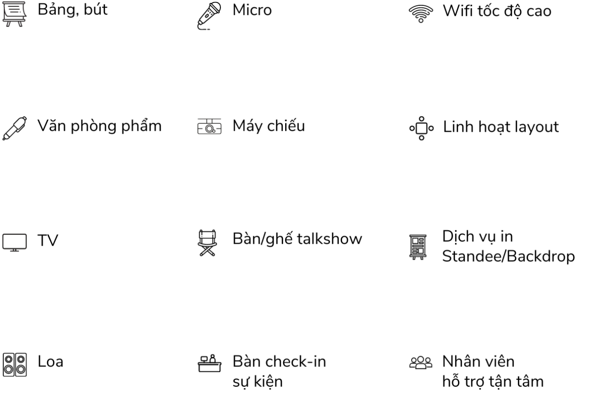 ✓ Đội ngũ vận hành chuyên nghiệp hỗ trợ thiết lập bàn ghế và trang thiết bị theo yêu cầu, giúp trung tâm tiết kiệm thời gian và chi phí nhân sự để set up.